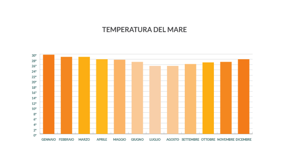 Il mare è caldo durante tutto l’anno, con temperature che vanno dai 26 gradi dei mesi di Luglio e Agosto, ai 29-30 del periodo Gennaio-Marzo. Anche in profondità, gli amanti delle immersioni subacquee godranno di un mare che difficilmente scende sotto i 25 gradi sino a 20-25 metri di profondità.